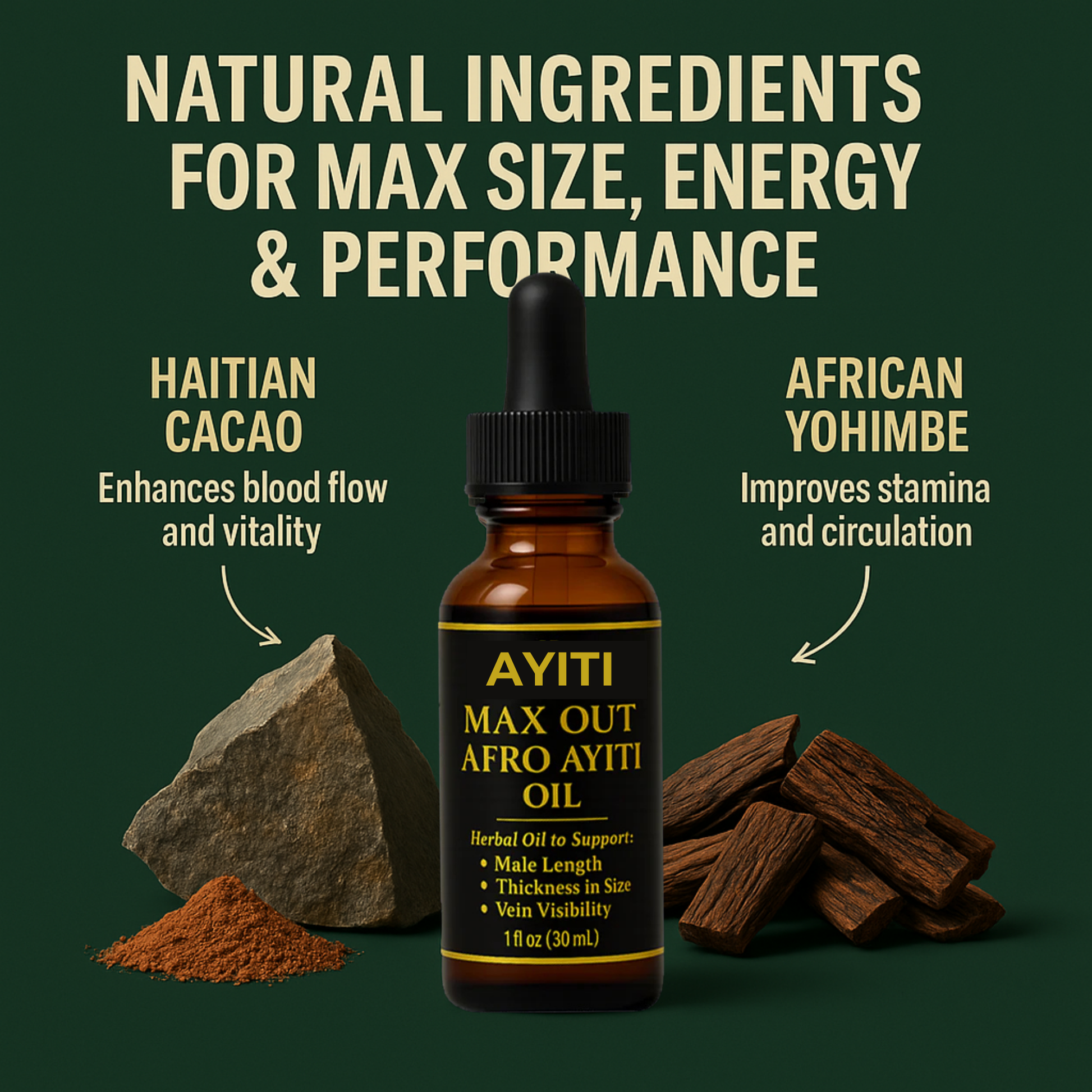 Max Out Ayiti Oil is different. The natural compounds improve circulation and expand skin-tissue, which adds length + girth, and helps you achieve fuller, firmer, and longer-lasting hardness,on demand.